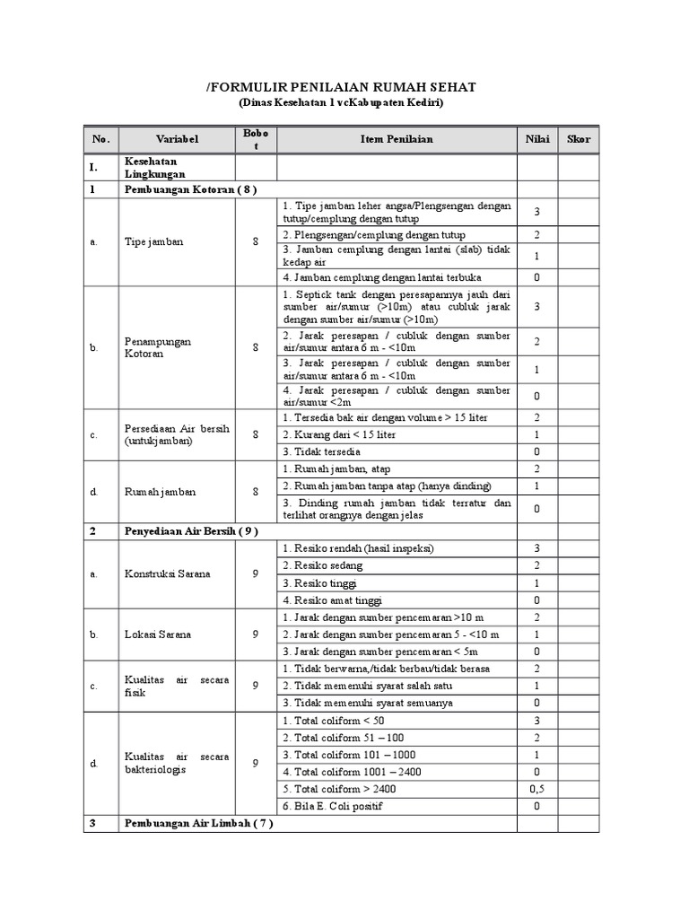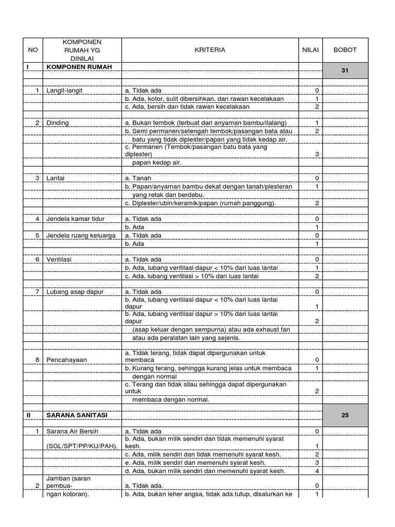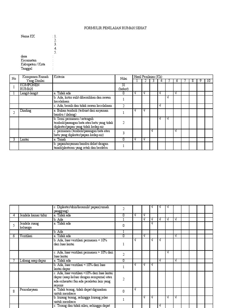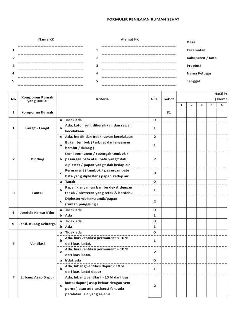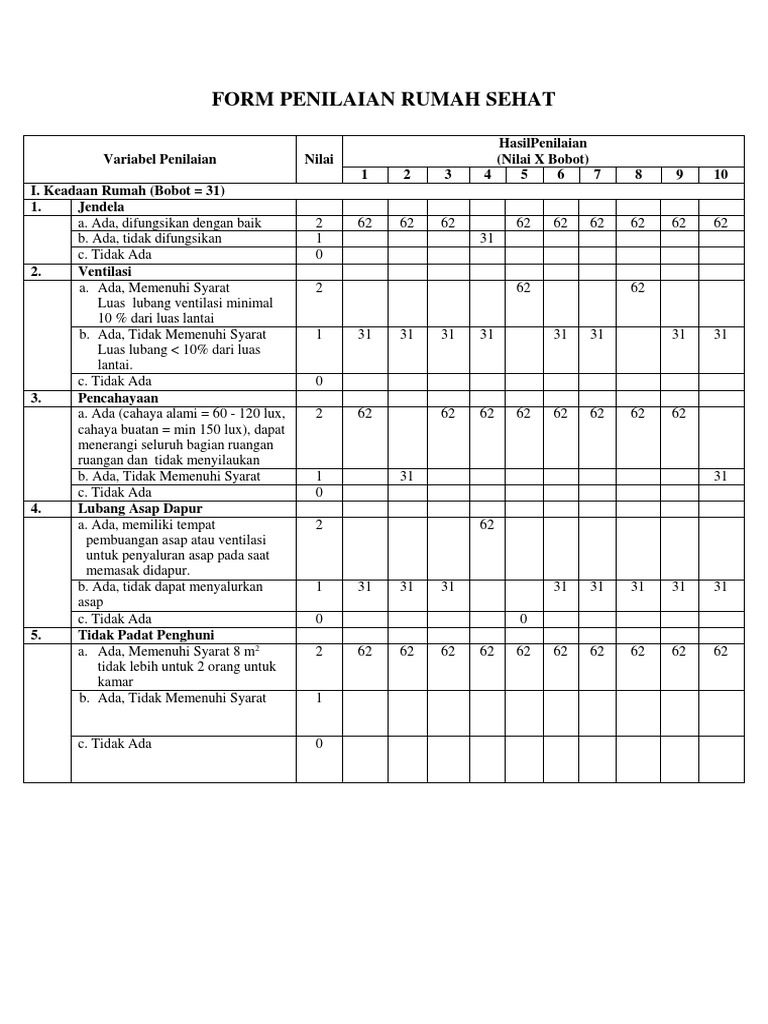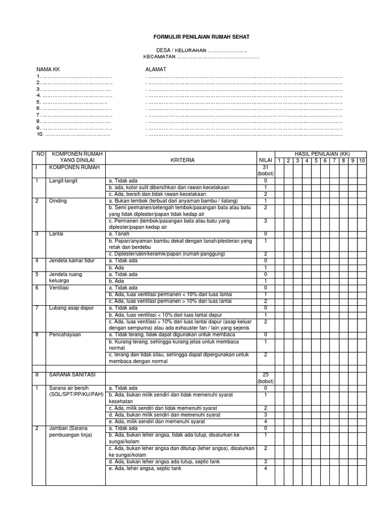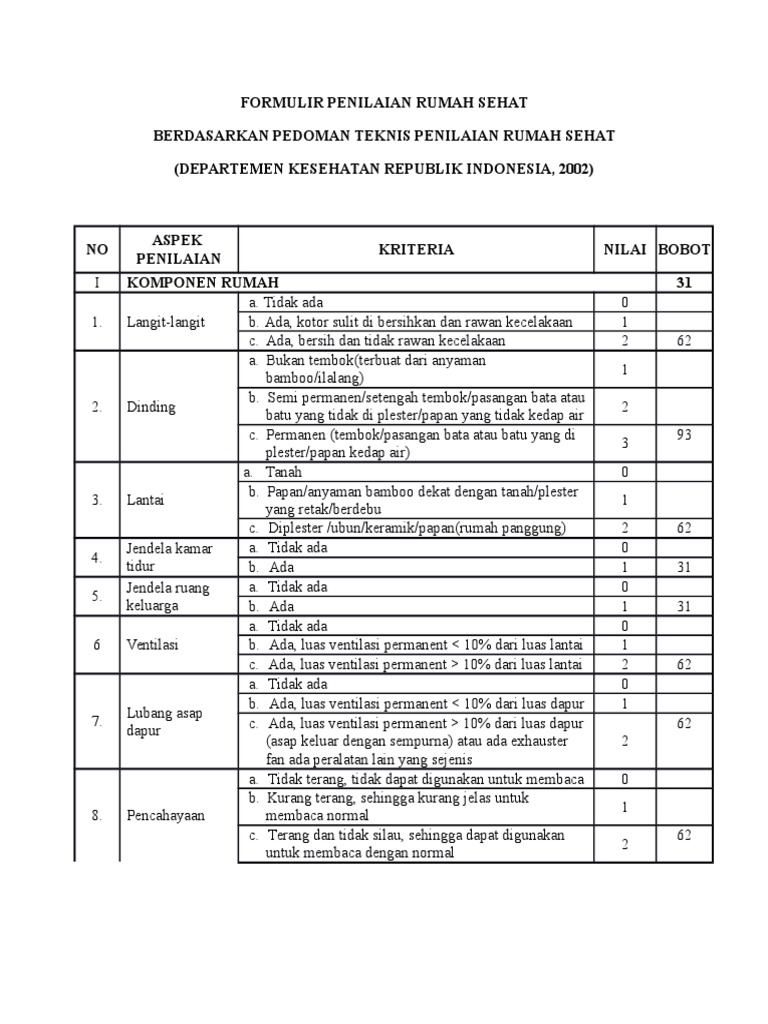Penilaian rumah sehat adalah pemeriksaan komprehensif terhadap rumah untuk mengidentifikasi potensi bahaya lingkungan yang dapat mempengaruhi kesehatan penghuninya. Penilaian ini meliputi evaluasi mendalam terhadap: